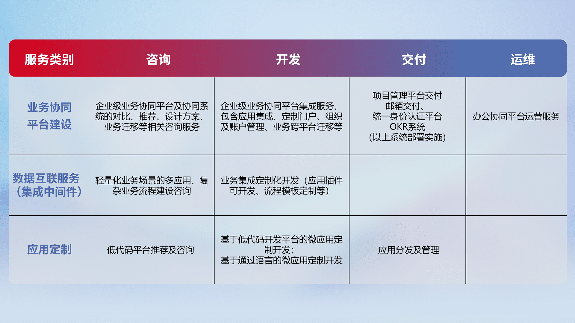 针对钉钉、、企微、、IDaas等平台级产品提供产品的规划、、、、方案、、、、交付、、、、定制化开发等服务,,,实现如统一协同办公、、、、智能客户服务、、、混合会议管理、、、智能数据查询、、等业务场景,,,实现数字化转型。。。