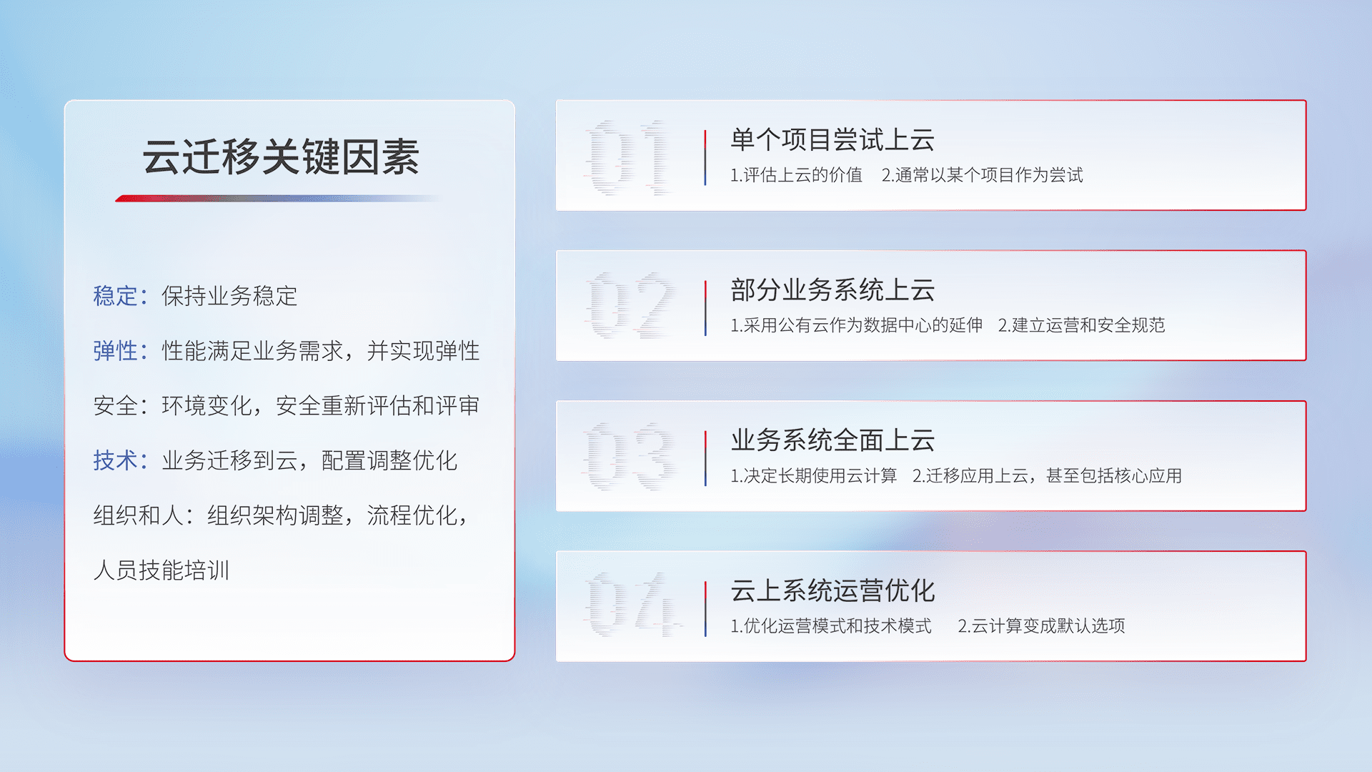 结合实际业务,,,,从规划设计、、、云平台选型、、云原生改造、、、数据迁移、、集成交付,,,,迁移全过程为客户识别最佳上云路径,,,,做好风险识别管理,,,设计网络架构、、、身份权限、、、安全审计合规、、、、操作审计、、日志审计、、、监控告警策略、、多站点容灾设计等,,,,对云上基础设施进行整体规划,,提升IT治理水平,,,以满足弹性、、、、高可用、、、高性能的需求。。。